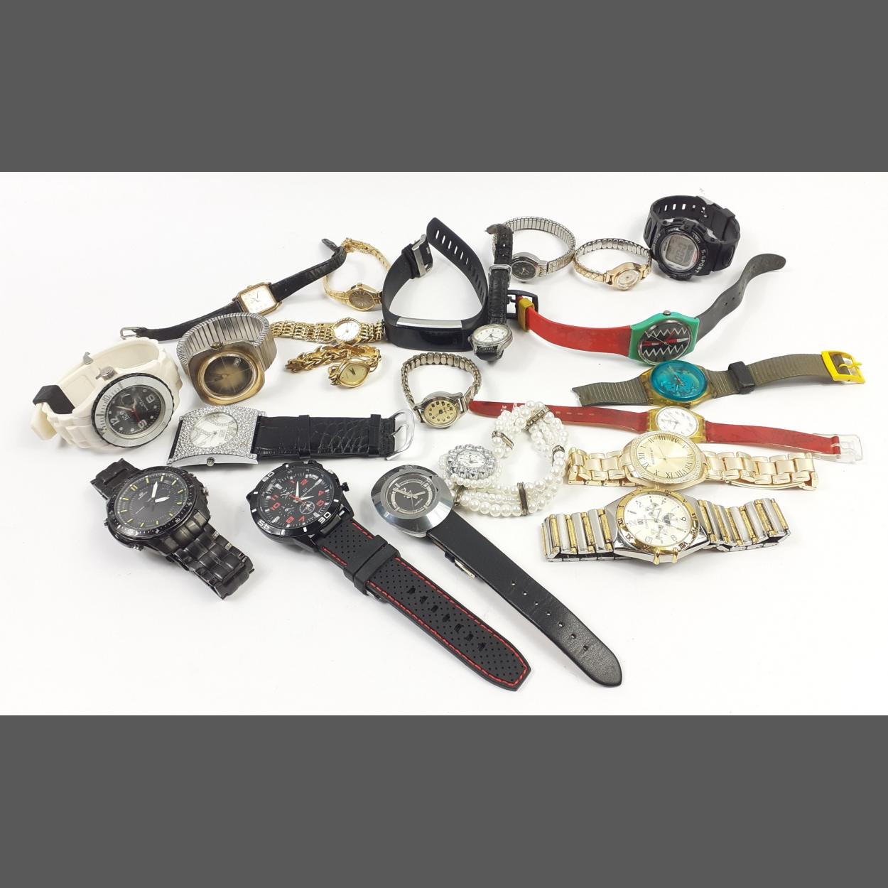An interesting collection of wristwatches to include a RADO DIASTAR water sealed quartz (damage to case), a CASIO EDIFACE 4334, a GT W5373, a 1970s TIMEX, Swatches, Madden Girl, ICE, Eton and others. 22 watches in total, all untested and may have wear.