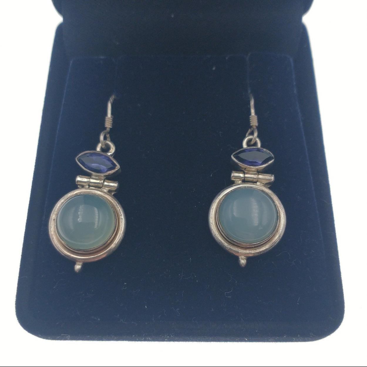 A pair of 925 stamped silver drop earrings with moon stones and blue stones , 2.5cm drop, gross weight 7.75g