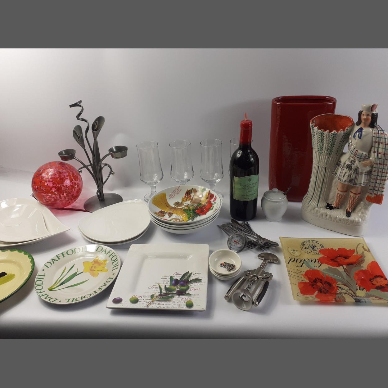 A box of assorted ceramics and glass to include a FLATBACK , LARGE RED VASE , METAL CANDLE HOLDER and several PLATES etc