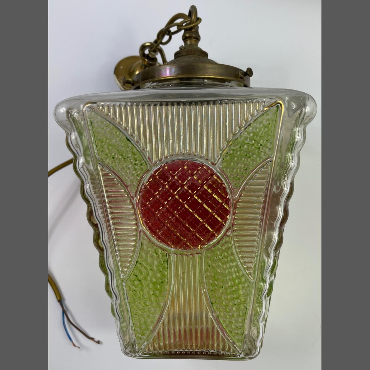 A nice quality coloured and clear pressed glass ArtDeco hanging light - dimensions of shade diameter 19cm x height 35cm total - a really nice light!