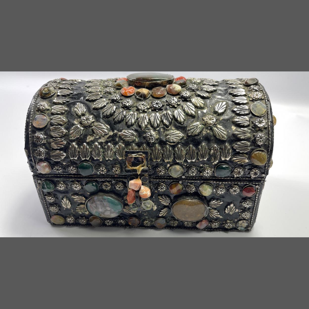 An ATTRACTIVE white metal and agate covered domed jewellery box - a couple of pieces of SCOTTISH agate stone have come off the locking-hinge otherwise looks really nice! - dimensions 20cm length x 13cm height x depth x 13cm