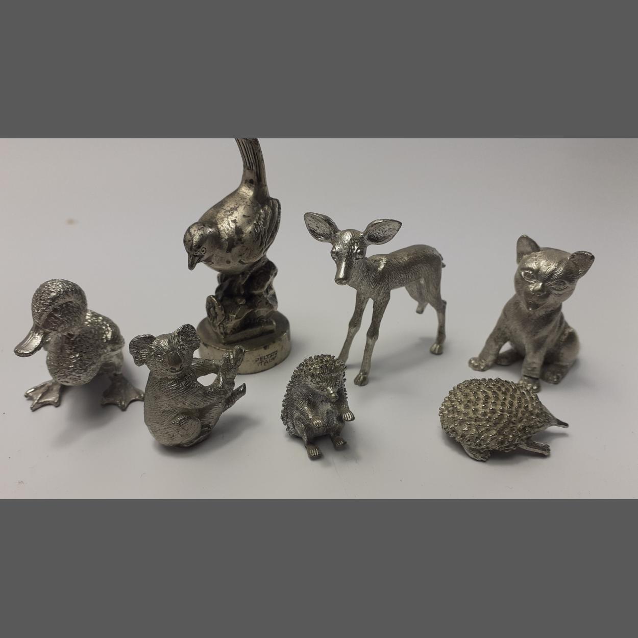 A selection of seven miniature METAL ANIMALS by various makers the largest being a 6cm tall bird figure and the smallest a HEDGEHOG of 2.25cm tall