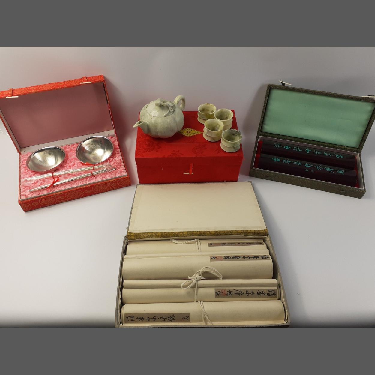 An interesting collection of boxed oriental items to include a soapstone green jade coloured teapot and four matching cups, two white metal bowls with skewers, two very solid wooden calligraphy wrist rests and a boxed set of four painted scrolls.