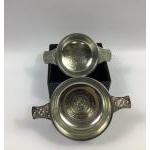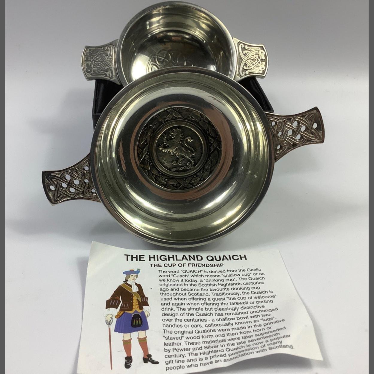 Two pewter quaiches, one from Scottish Piper Pewter, boxed 9.5cm dia, and one other 8.5cm also boxed