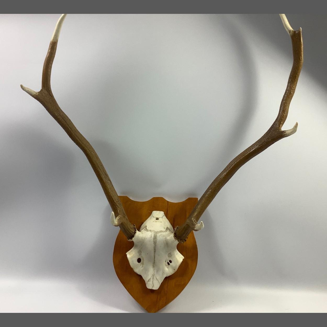 A taxidermy set of 6-pointed deer antlers mounted on a wooden shield approx 30cm long, antlers approx 55cm long