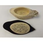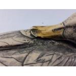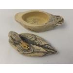 A trinket dish in the form of a DUCK with a panel of DUCKLINGS on the inner and an image of a DRAGONFLY on the base of the inner , the duck has a minor historical chip to the beak however this does not detract from the overall look , 17cm long