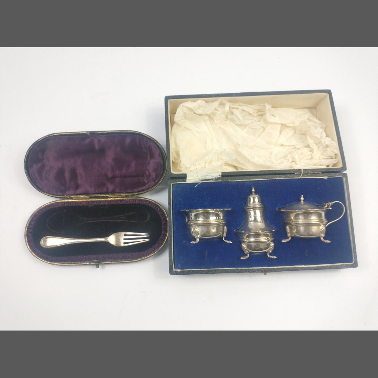 A boxed condiment set, with blue glass liners, silver hallmarked, Birmingham 1930, gross weight 175g, and a small monogrammed fork, silver hallmarked, Sheffield 1895, in a presentation case, weight 25g
