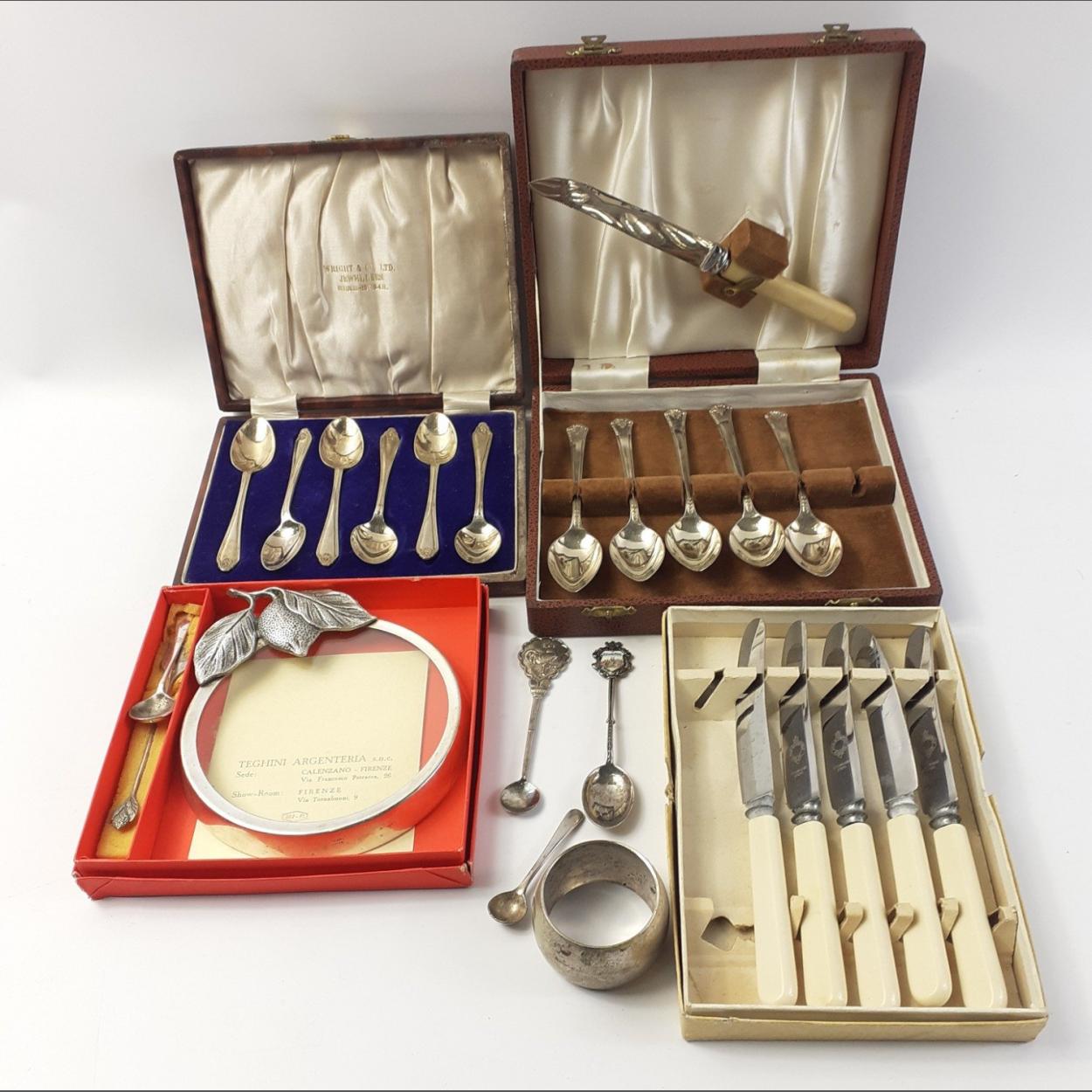 A boxed set of 6 EPNS teaspoons, a boxed set of 5 EPNS teaspoons with cheese knife, a set of 5 butter knives, an EPNS napkin ring, 2 salt spoons and a commemorative spoon from Mallorca, etc