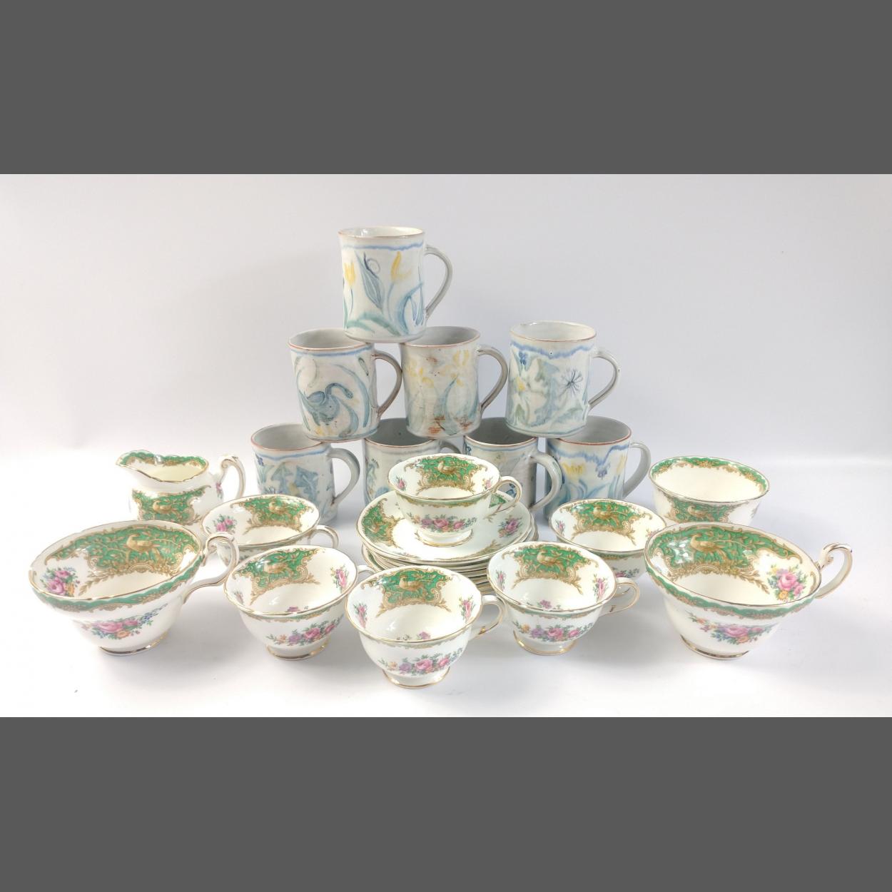 A part set of small FOLEY MONTROSE tea set fine bone china to include, cream and sugar bowls, six small cups and saucers, two larger tea cups. Box also includes eight home style art pottery mugs.