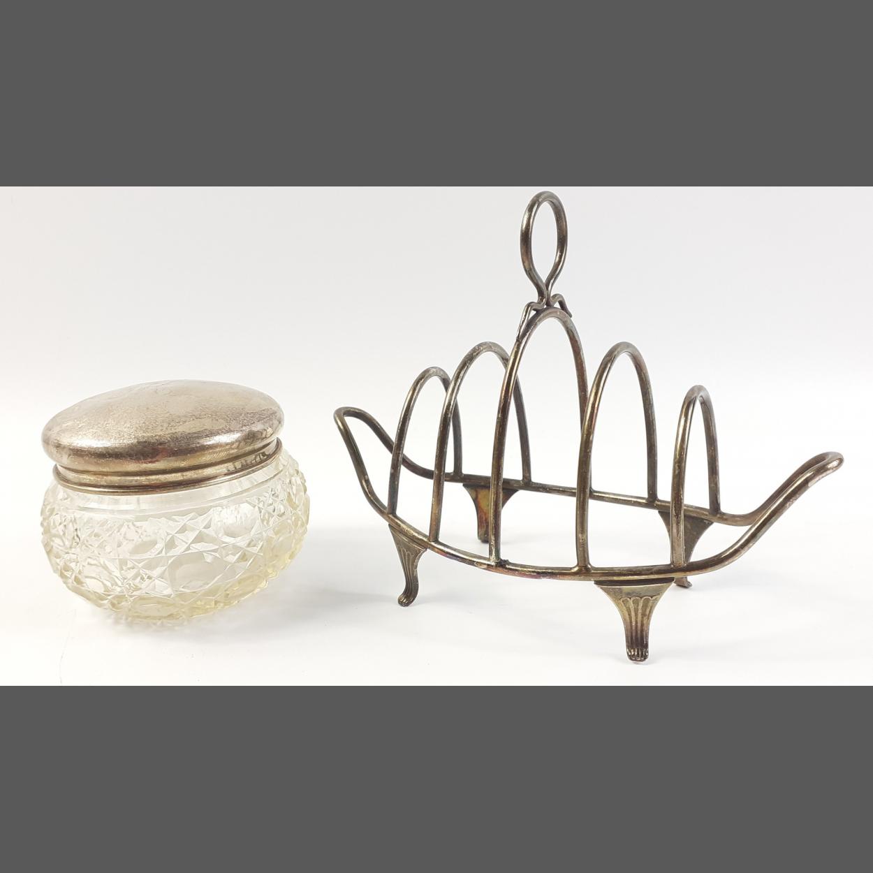A cut glass bowl (lid 7cm dia) with a monogrammed ('K') silver hallmarked lid (indistinct markings) weight 16g, and a silver toastrack (15cm long) hallmarked London 1929, weight 98g