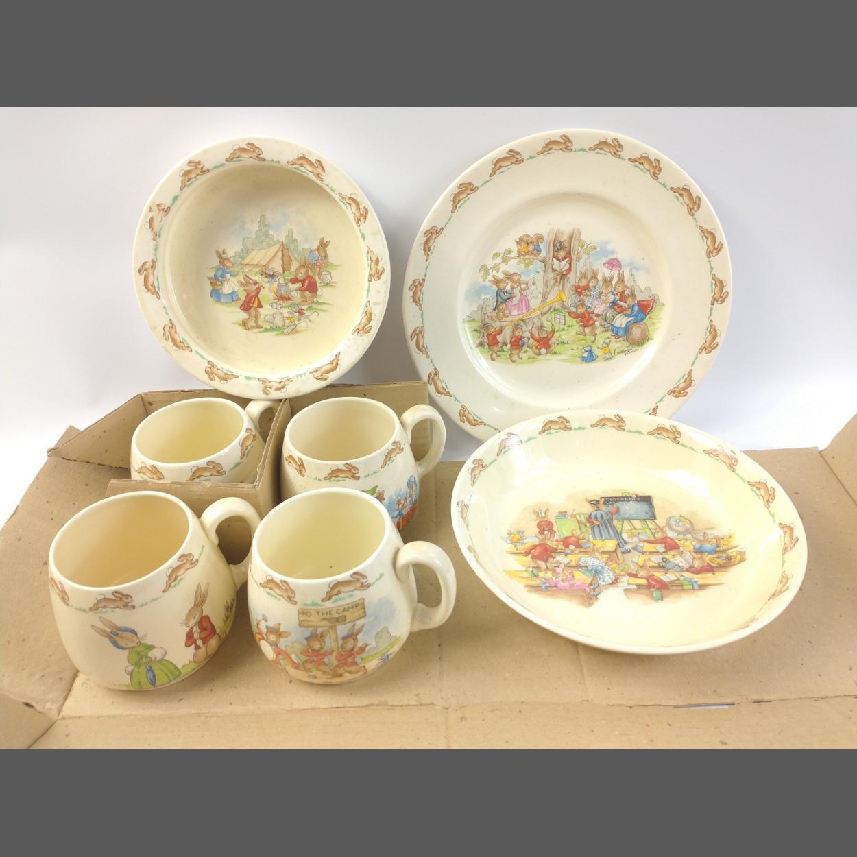 A super little collection of delightful vintage Royal Doulton BUNNYKINS pieces. To include four lovely mugs in a box all with different scenes, a 22cm plate, a 19cm plate and a 16cm baby bowl. The baby bowl has wear to the rim but all other pieces are in lovely condition. A very attractive lot.