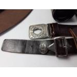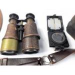 Vintage Scout Hat with a size label stating Long Oval 7 3/4. Also includes a Sam Brown style cross belt a small khaki belt, a Girl Guide belt and a pair of binoculars marked 'Jumelle Marine' with good optics but body A/F also another pair of binoculars in small fitted case and a T.G. Co. Lts Military MkI Broad Arrow marked marching compass.