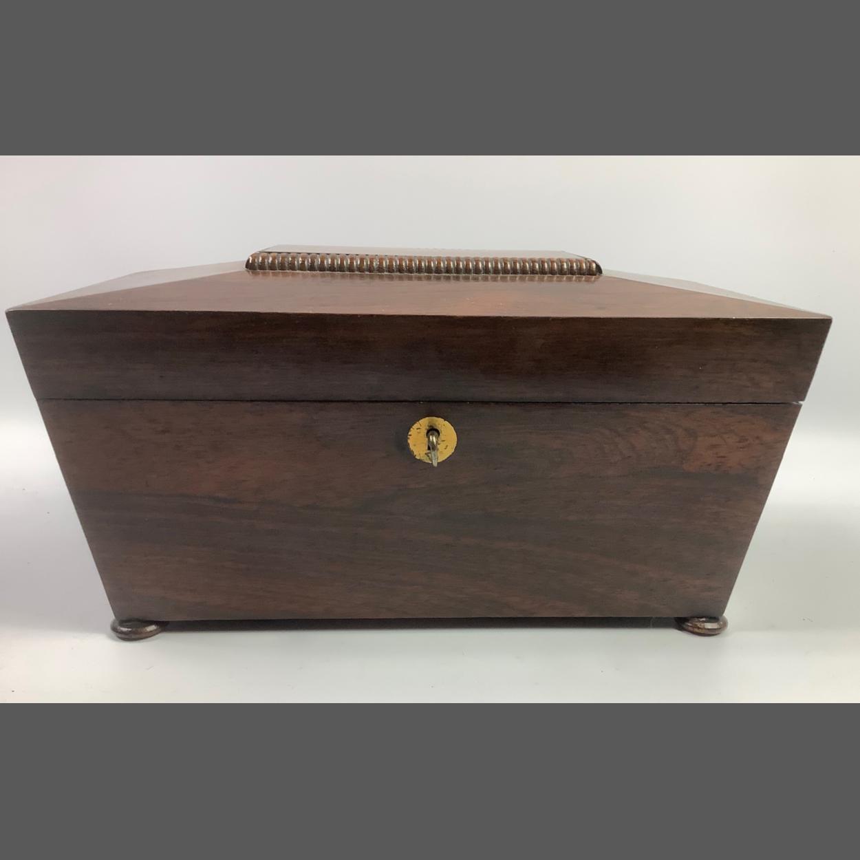 A lovely rosewood sarcophagus TEA CADDY with original key and 4 button feet. Interior has 2 sections and a cut-glass bowl for mixing blends, measures 31x16x14cm