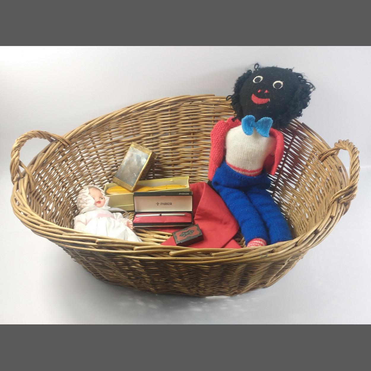 A mixed lot to include a wicker laundry basket (or log basket) (approx 70cm wide and 28cm high) plus a red cummerbund, a Parker fountain pen, a lacquered snuff box and a couple of dolls,