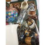 A QUALITY mixed box to include treasures such as a cow bell with embroidered strap, an old wash-board, a carved wooden box, and lots of various pieces of china
