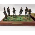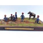 Two Diorama mounted scenes, free standing, period die-cast hand painted soldiers with canon with Indian Army mounted battery and the other 'Roll-Call' walking wounded(fixed soldiers) and 12 soldiers in total - dimension 30cm x 17cm, the smaller one 21cm x 13cm approx