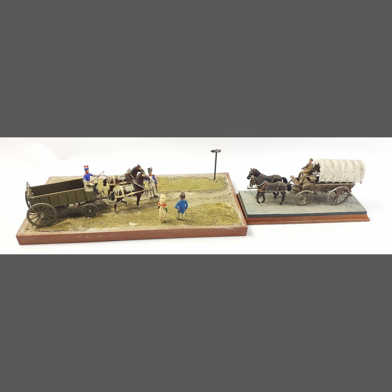 Two Diorama mounted scene, period French dragoon supply wagon scene resin hand painted soldiers with two soldiers and two civilians in total - dimension 41cm x 20cm mount and the other die-cast mounted scene is a WWl covered wagon with two horses dimensions base is 25cm x 10cm approx