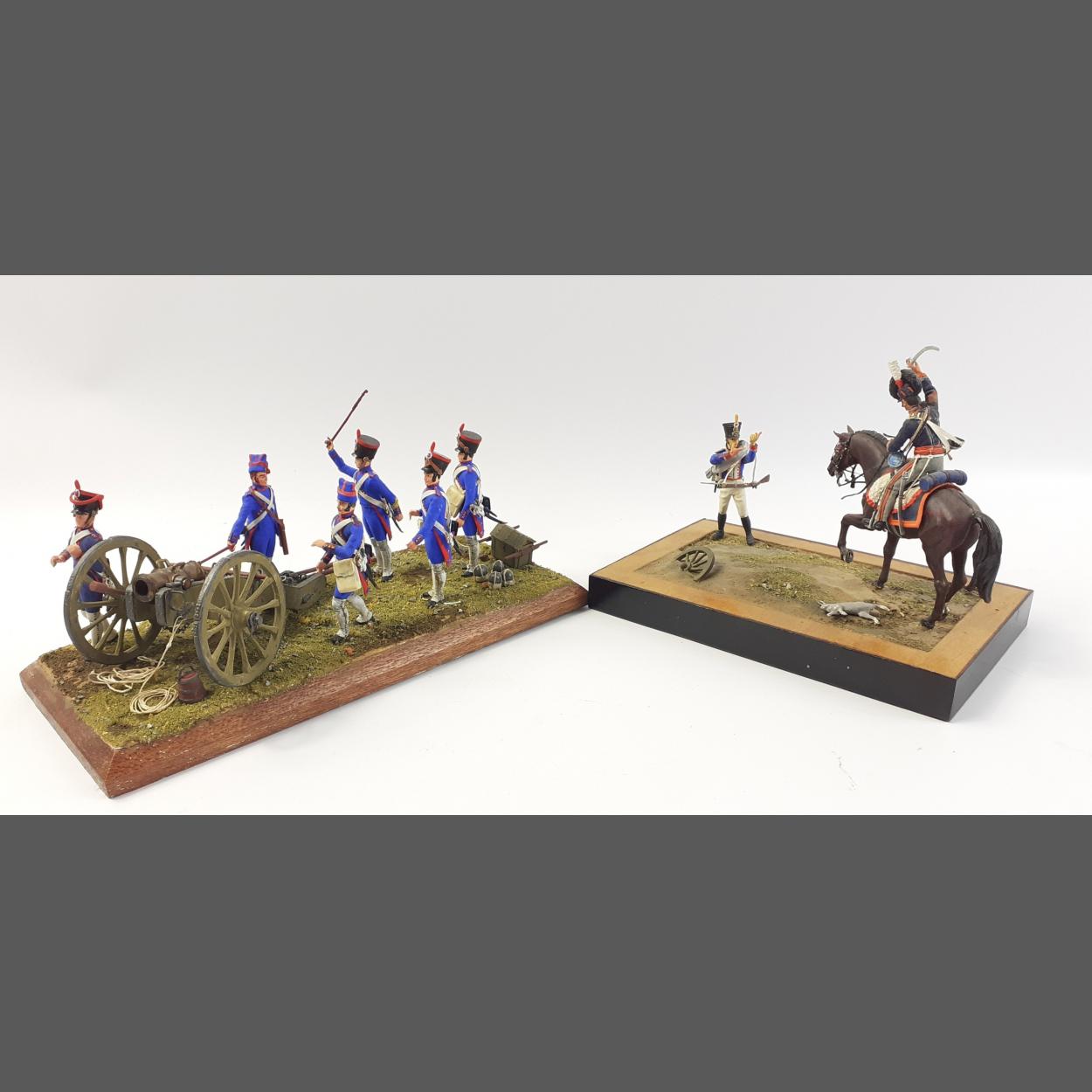 Two Diorama mounted scenes, period hand painted dragoons, one with artillery dimensions 22cm x 10cm approx with 6 soldiers, the other, mounted cavalry, is 16cm x 10cm with two figures and a horse, - dimension 28cm x 23cm mount approx