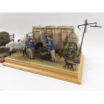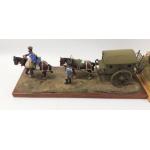 Two Diorama mounted scenes, period dragoon artillery resin hand painted soldiers with a horse at a blacksmiths with three dragoons and a dog, - base dimensions 24cm x 14cm, the other scene is die-cast figures, with dragoons and two horses pulling a wagon - dimensions 30cm x 10cm