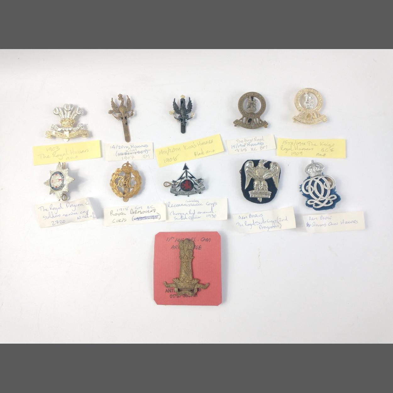 A collection of original Cavalry and Hussars cap badges to include Royal Hussars Staybrite, 14/20 Kings Hussars variants, 15/19th Hussars variants and others. 11 badges in total all in excellent collectible order many complete with original collectors annotated notes.
