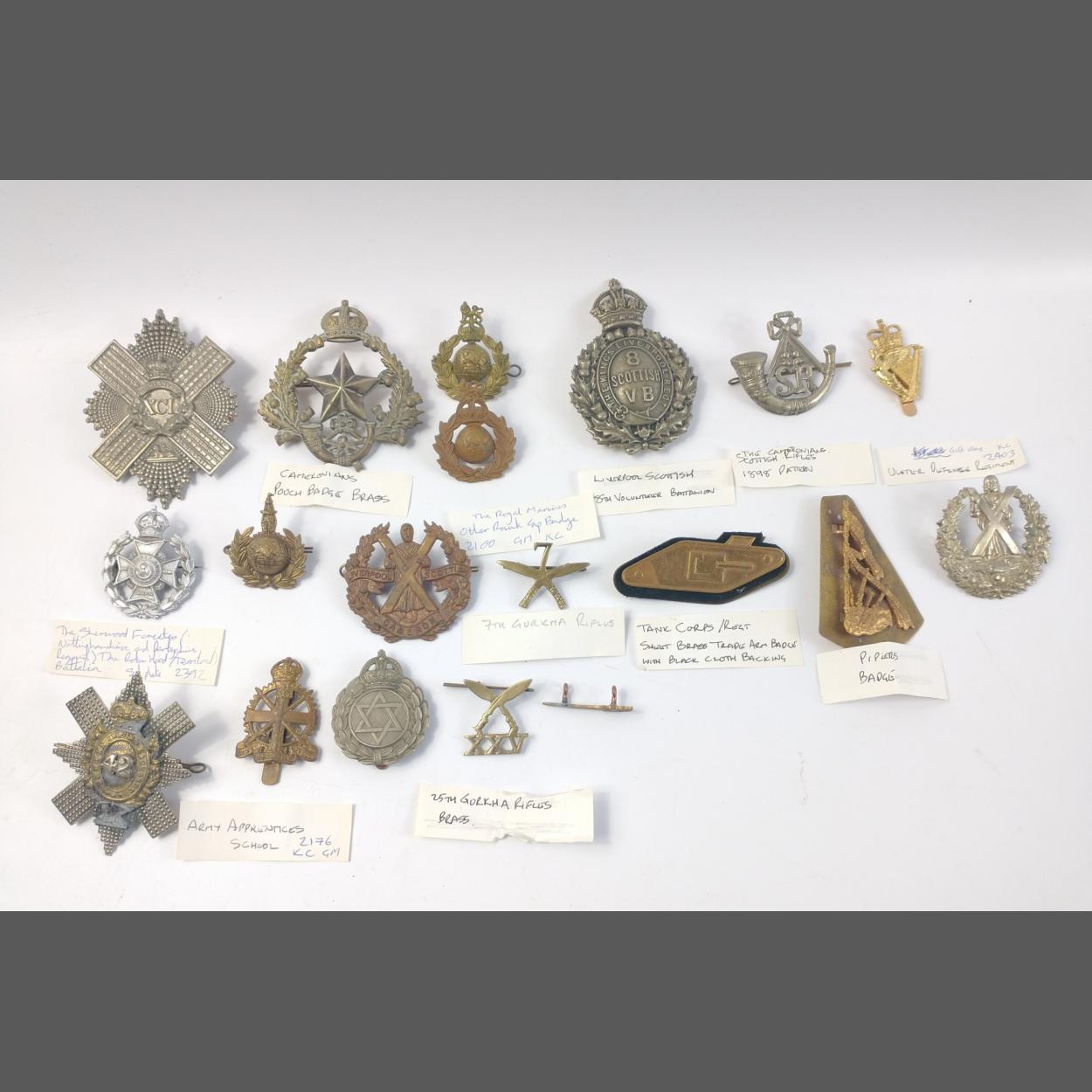 A collection of original Scottish Regiment and other cap badges to include 42nd Foot Glengarry Badge, Cameronians Brass pouch badge, Gordon Highlanders, Liverpool Scottish Volunteers, early Scottish rifles pattern 1898, 25th Gurkha and others. 11 badges in total all in excellent collectible order many complete with original collectors annotated notes.