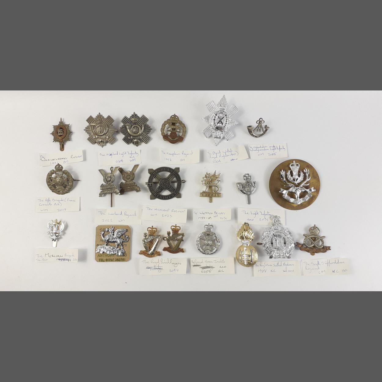 A collection of original Infantry cap badges to include Worcestershire Regiment, Lowland Regiment x2, Rifle Brigade,Highland Regiment, Wessex, Royal Hampshire and many others including some staybrite. 21 badges in total all in excellent collectible order many complete with original collectors annotated notes.