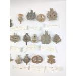 A collection of original British Military Regimental Cap Badges to include South Lancashire, Kings Own Scottish Borderers, East Lancashire, Royal Welsh Fusiliers, Welsh Regiment and many others. 23 badges in total all in excellent collectible order many complete with original collectors annotated notes.
