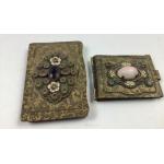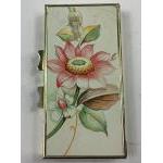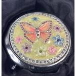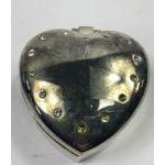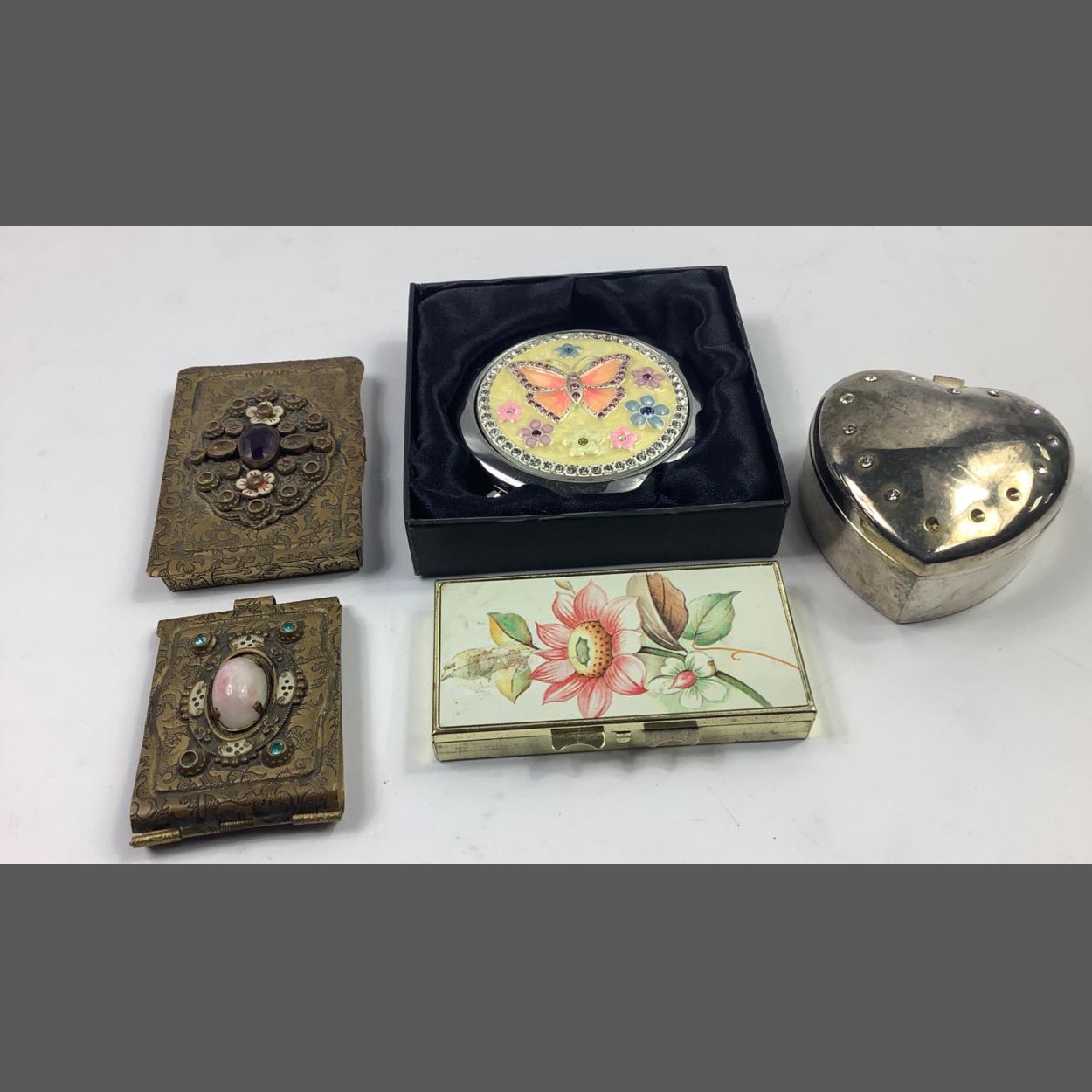 A small collection of trinket boxes etc to include a weekly pill box, a lined heart-shaped trinket box (7cm width, missing 3 stones), an unused Sophia mirror compact with a butterfly design (7cm dia) with a dedication on the back, a highly decorative match book cover (6x4.5cm) and card case (8x5cm),