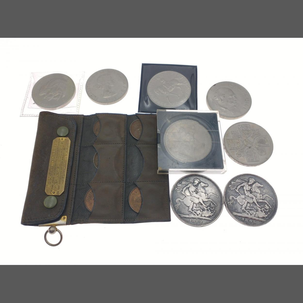 Two VICTORIA Silver Crowns 1895 and 1889 in fair/good condition and 6 commemorative coins crown sized coins with a leather stud pouch with 5 Farthings
