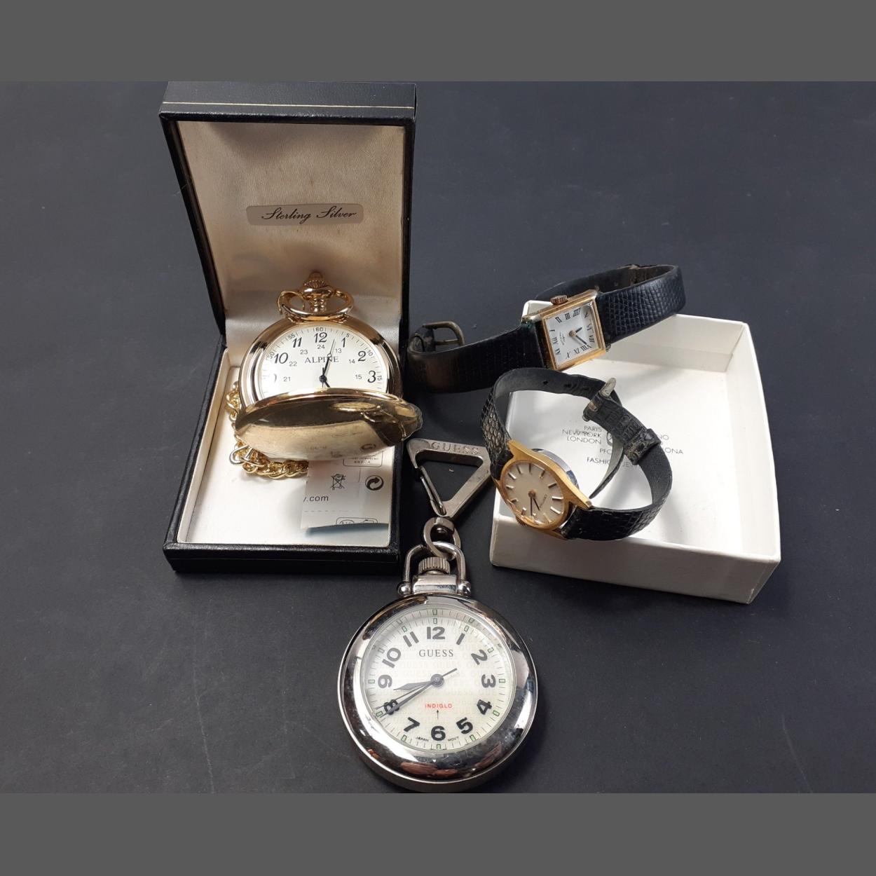 A little parcel of Time. A bag to include two vintage gold plated ladies cocktail watches, A ROTARY and a CERTINA. An Alpine quartz watch and a GUESS click on fob watch. All untested.