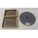 A small PERSIAN inlaid box with bone trim, the box measures 13cm x 9cm x 4cm and is inlaid inside and out, also a modern 16cm TURKISH ceramic trivet