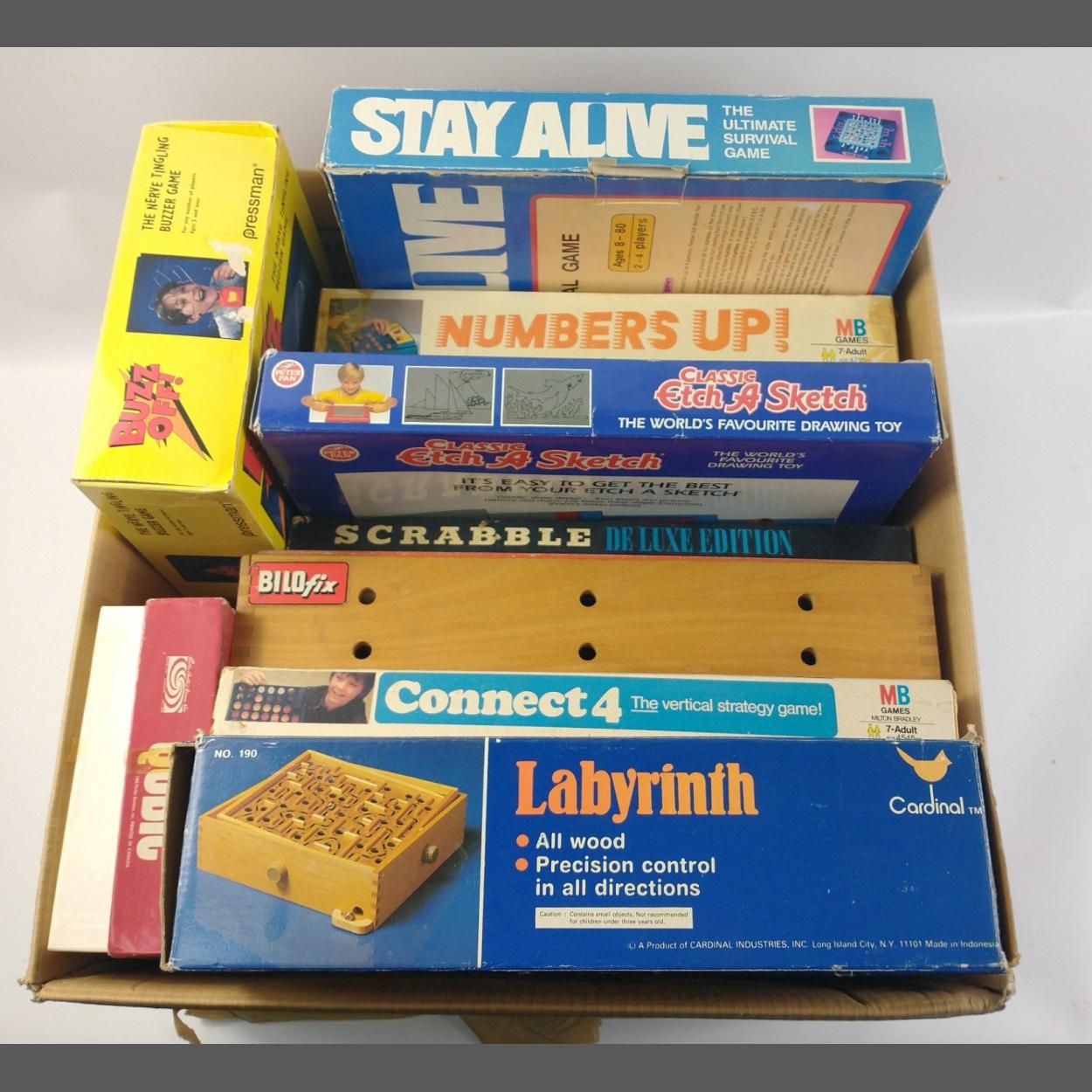 A box full of vintage GAMES and GAMES including Stay Alive, Numbers Up, Buzz Off, Etch a Sketch, Scrabble, Bilo Fix, Connect 4, Labyrinth and Qubic