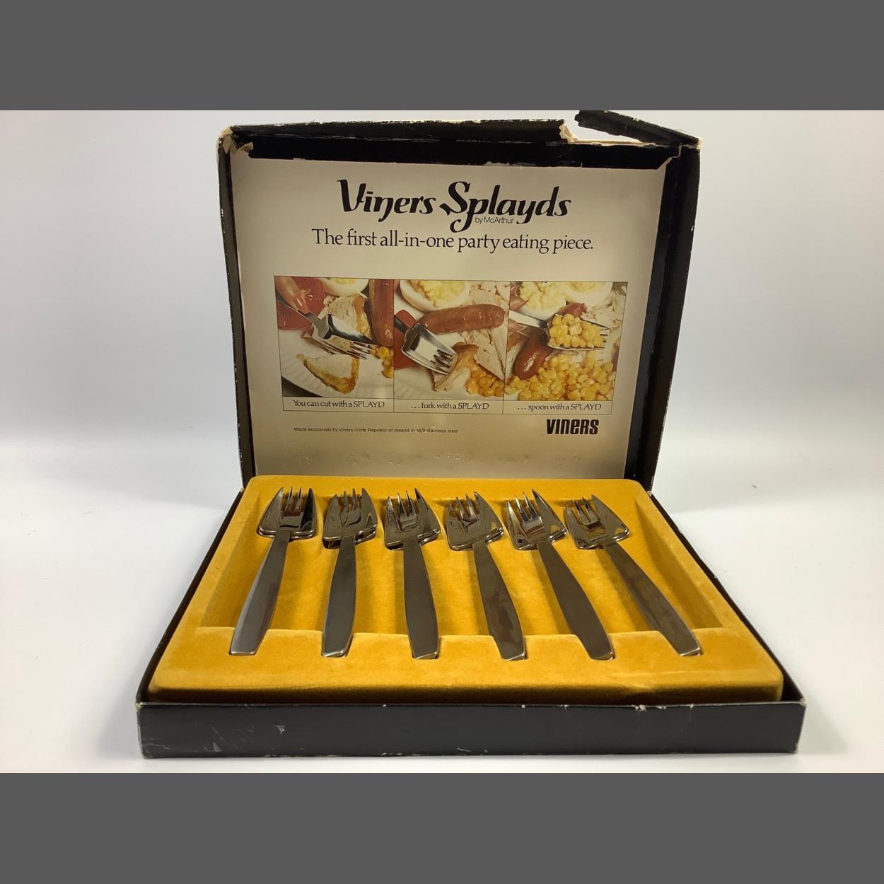 A set of twelve Viners SPLAYD all-in-one party eating piece all in original box. These implements can be to cut, fork or spoon food items. Vastly superior quality to a plastic spork. Box has some damage but Splayds are in excellent condition.