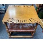 An UNUSUAL! VICTORIAN low oak armchair/table with a brown leather seat pad - dimensions 2ft wide x 2.5ft high approx