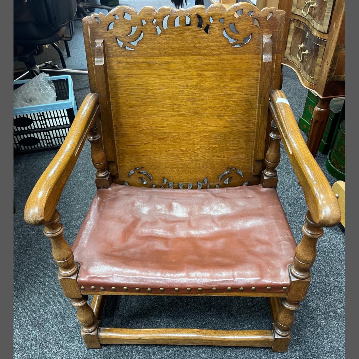 An UNUSUAL! VICTORIAN low oak armchair/table with a brown leather seat pad - dimensions 2ft wide x 2.5ft high approx