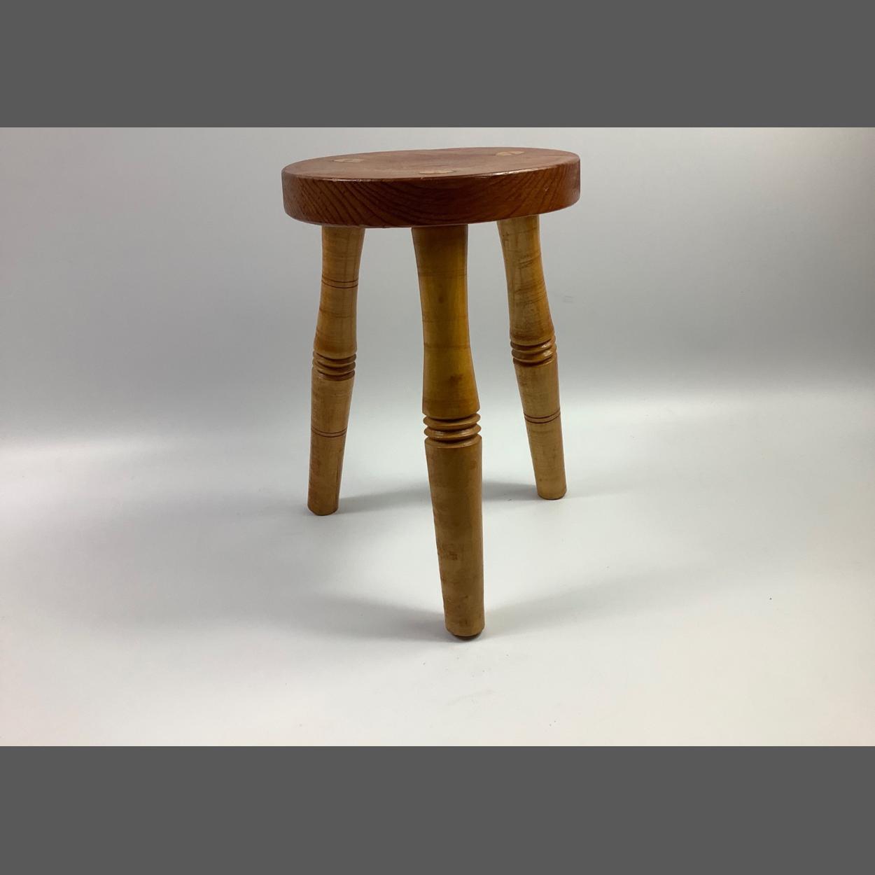A small three-legged stool in pine seat is 19cm dia, height 29cm