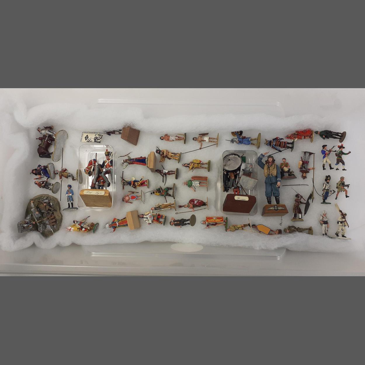 A collection of diecast and plastic painted military army figures from various historical eras. Many have regimental details noted on base. Mainly unbranded some HISTOREX. Over 40 figures in total. May have minor loose parts.
