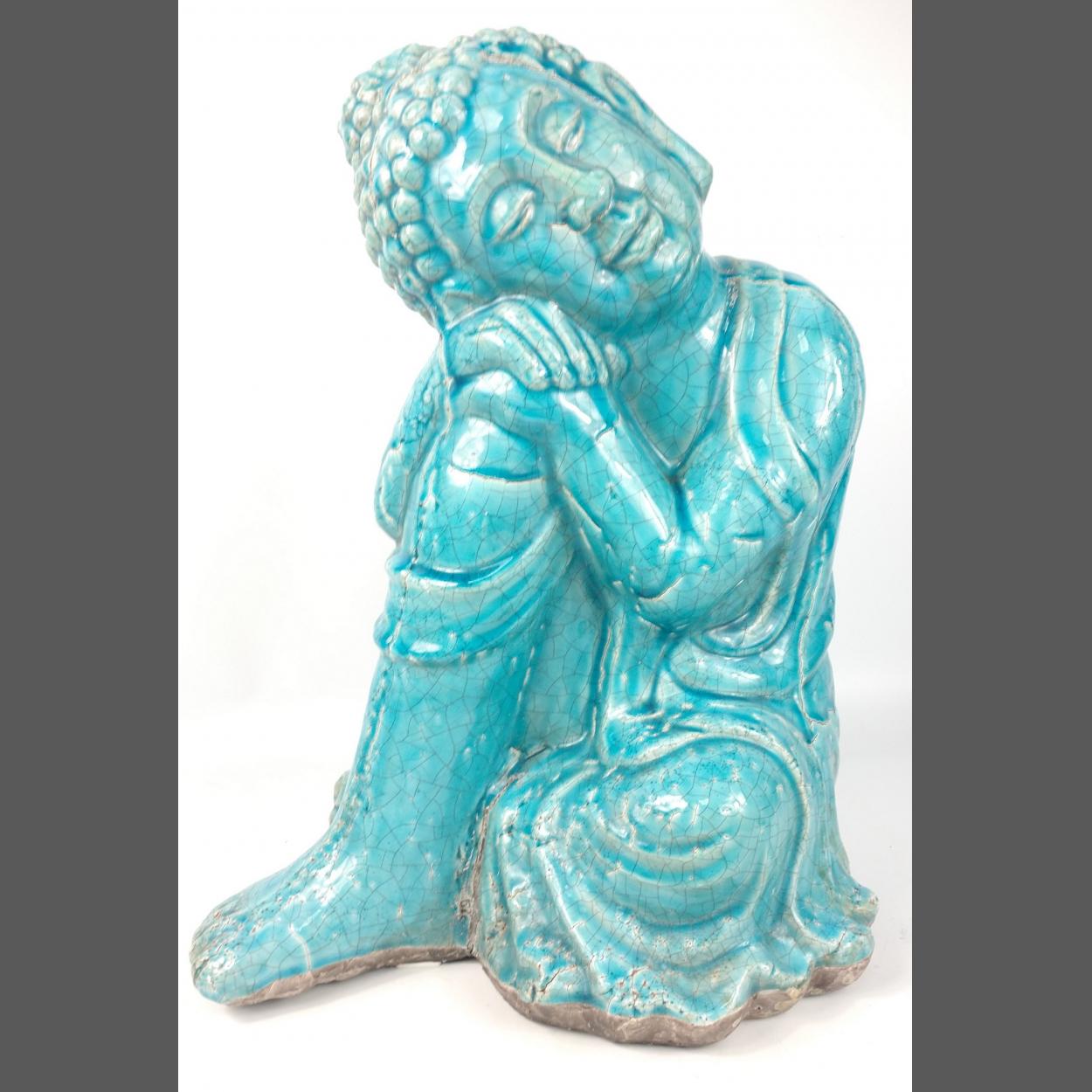 FABULOUS PATINA turquoise-blue crackle glaze stone ware oriental SLEEPING BUDDAH statue of substantial proportions. Believed to be mid century. Sits at an impressive 50cm. Exceptionally well sculpted, with cracking line which may be pre glaze. Very heavy even though it is hollow. A real statement piece !!