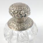 A VINTAGE perfume bottle standing 8cm tall with a silver collar and stopper both hallmarked London 1901, slight damage to the top of the thread