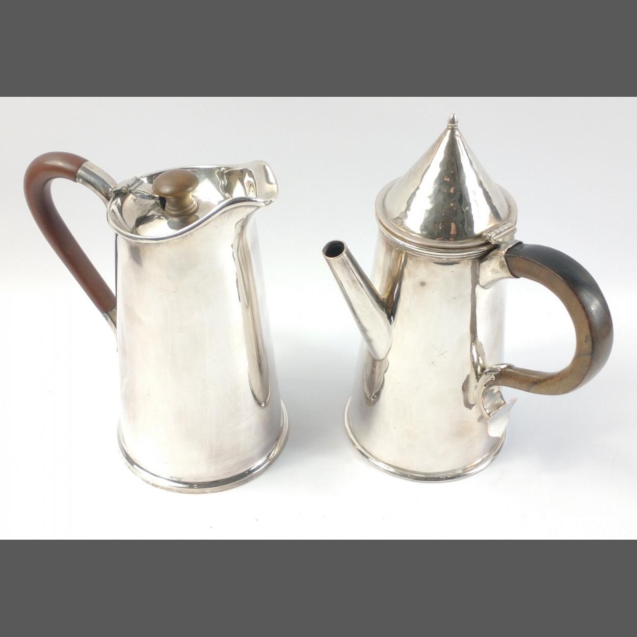 A quality DUCHESS OF SUTHERLAND CRIPPLES GUILD hot chocolate pot with wooden handle, stands approx 23cm high and an AIDE BROS silver plated thermos jug standing 20cm tall