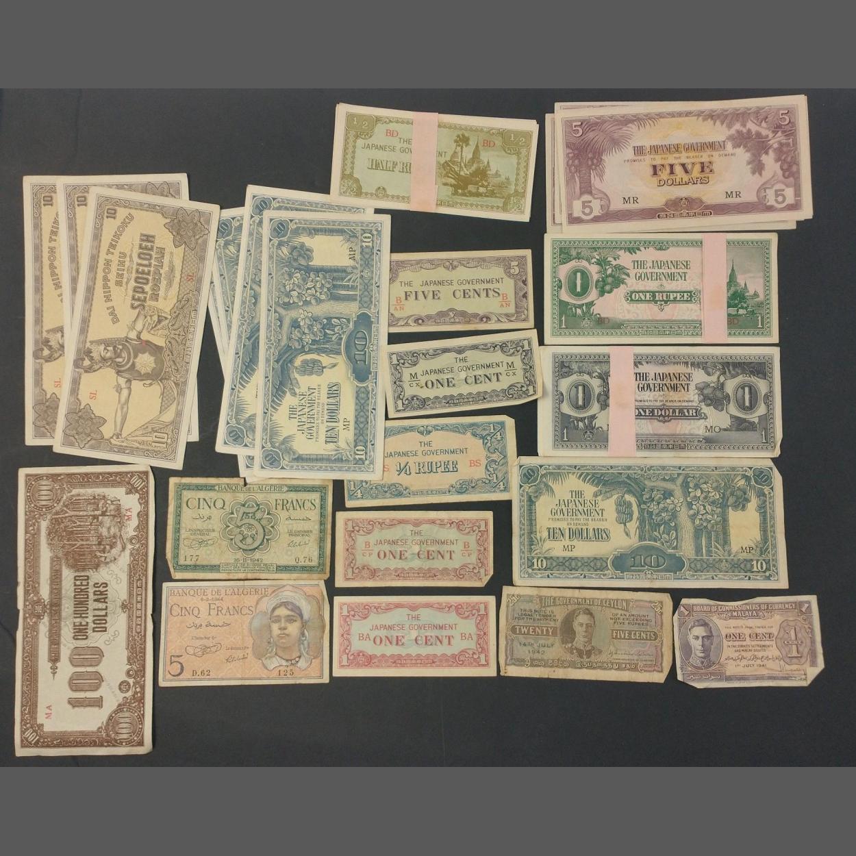 Banknotes - An interesting collection of JAPANESE GOVERNMENT wartime occupation notes in dollars, rupees etc. from WWII occupied territories such as Philippines, Burma, Siam etc. An interesting collection in generally good grades.