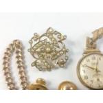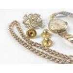GOLD An ACCURIST ladies cocktail watch with 0.375 9ct gold case and non gold bracelet - total gross weight 18g approx. Watch not currently running. Also a 9ct gold chain 11g weight approx and three 9ct gold studs combined gross weight 1.3g approx and a small seed pearl brooch marked 9ct with a gross weight of 5.4g approx.