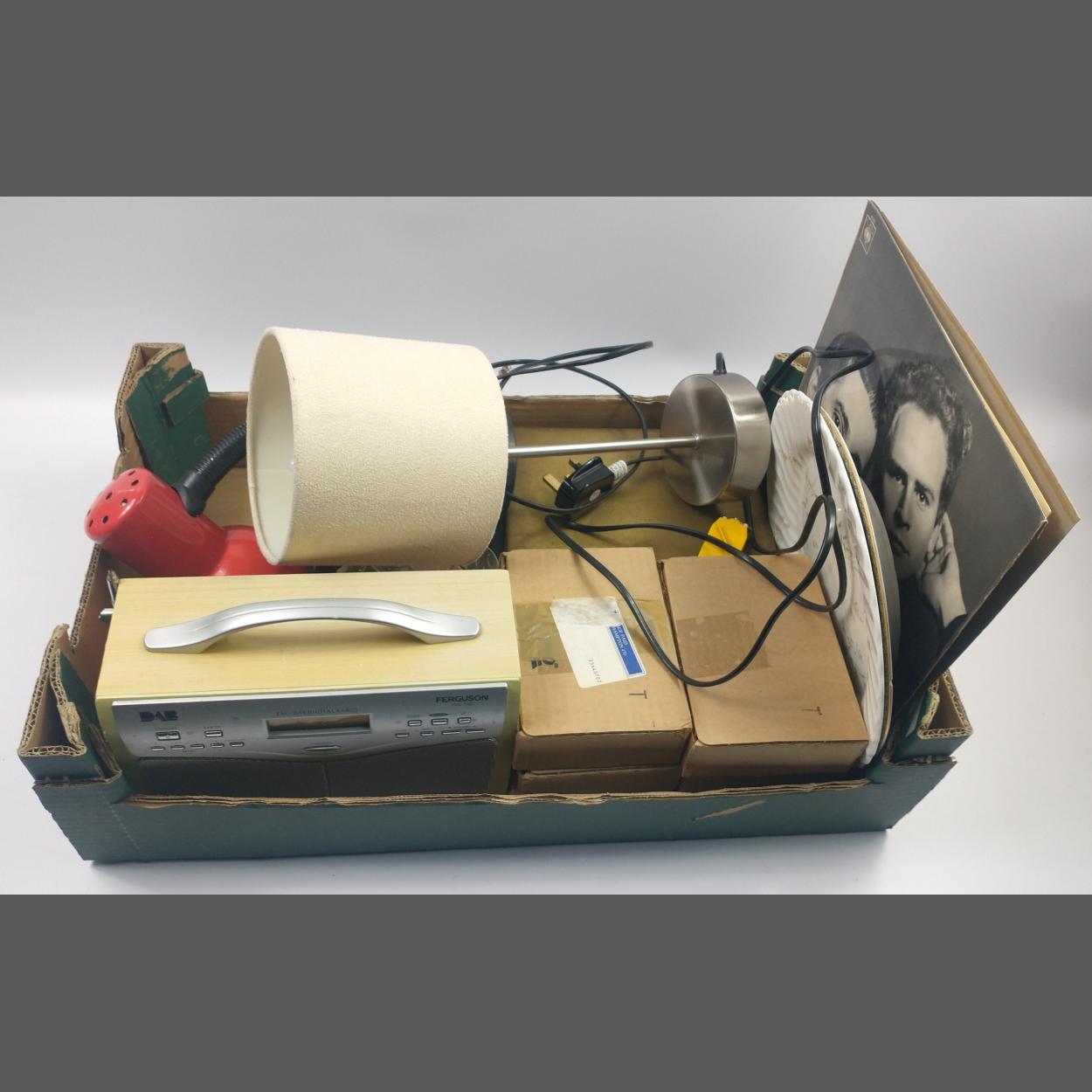 A mixed box to include 3 LLEDO 1920 Model T Tetley Teas vans, a Tetley Tea On the Road model van, a boxed set of 6 fish knives and forks, a three compartment relish serving dish with 3 forks, a gooseneck red table lamp, a Ferguson DAB radio, a small old-style money box with Victorian and George V copper coins amongst others, and a small table lamp (38cm high approx)