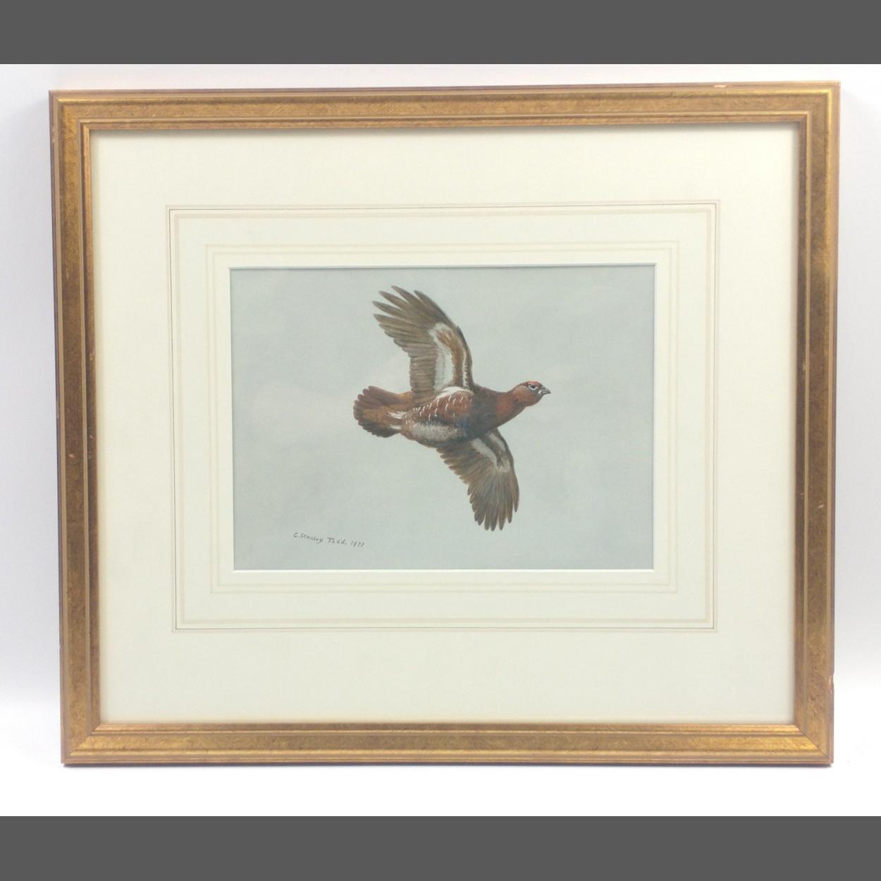 An original C STANLEY TODD watercolour of a flying grouse, in a gilt frame measuring 45x39cm approx ,