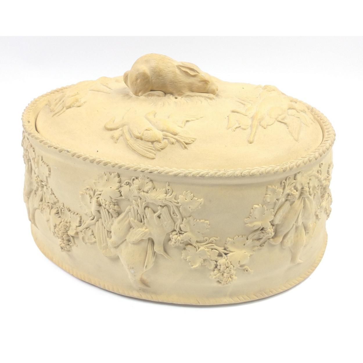 An antique Wedgwood caneware lidded game pie dish with hare finial handle c1840 30x20x13cm approx