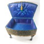 A lovely fabric covered sewing box stool. in excellent condition with nice blue silk interior. A very attractive and useable piece. 39cm high, 49cm wide, 29cm deep.