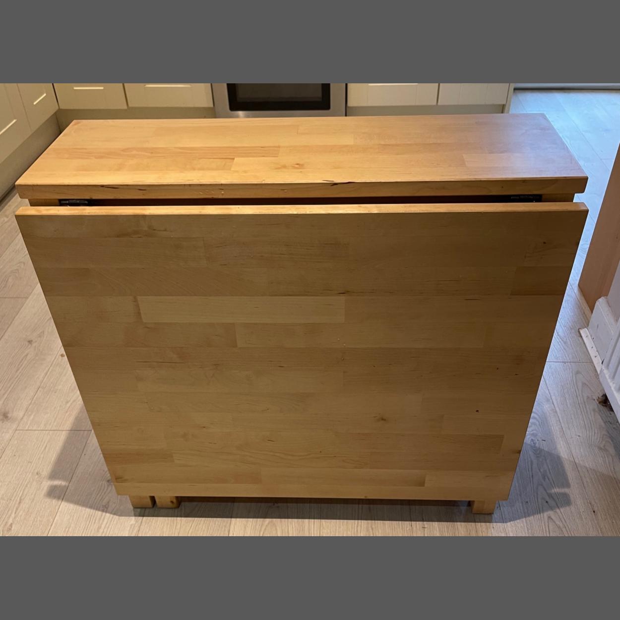A SUBSTANTIAL heavy pine effect gate -leg dining table with two large leafs which fold out - dimensions 6ft x 3ft approx when extended, comes with 6 drawers with a pair of light weight folding dining chairs