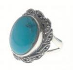 A silver ring, stamped 925, with turquoise coloured stone (2cm), surrounded by marcasite, Size P, gross weight 7.4g