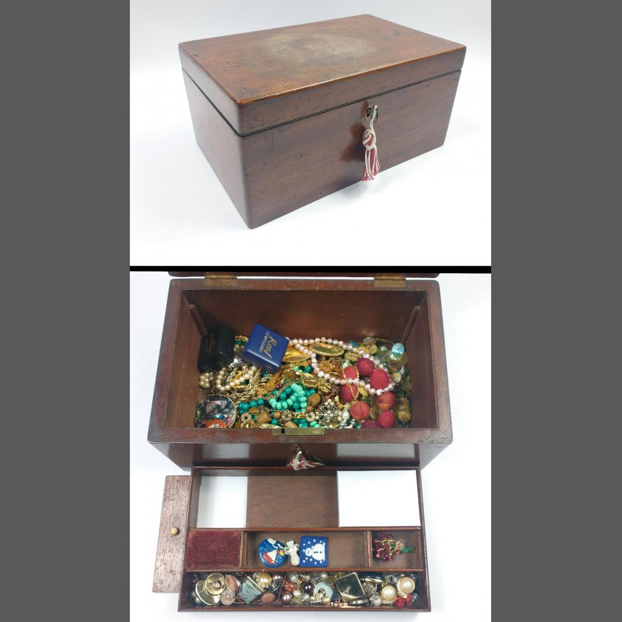 A VINTAGE mahogany wooden jewellery box complete with key and contents, mainly strings of beads and lots of earrings, 27x17x13cm
