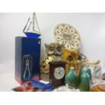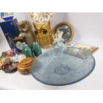 A mixed box of decorative items to include a boxed Cristal d'Arques decanter, a New Zealand wooden bowl made from 6 native woods 14cm dia approx, a WEDGWOOD Shakespeare's characters plate (25cm dia), a glass bowl with gilt highlights 29cm dia, a small carriage clock
